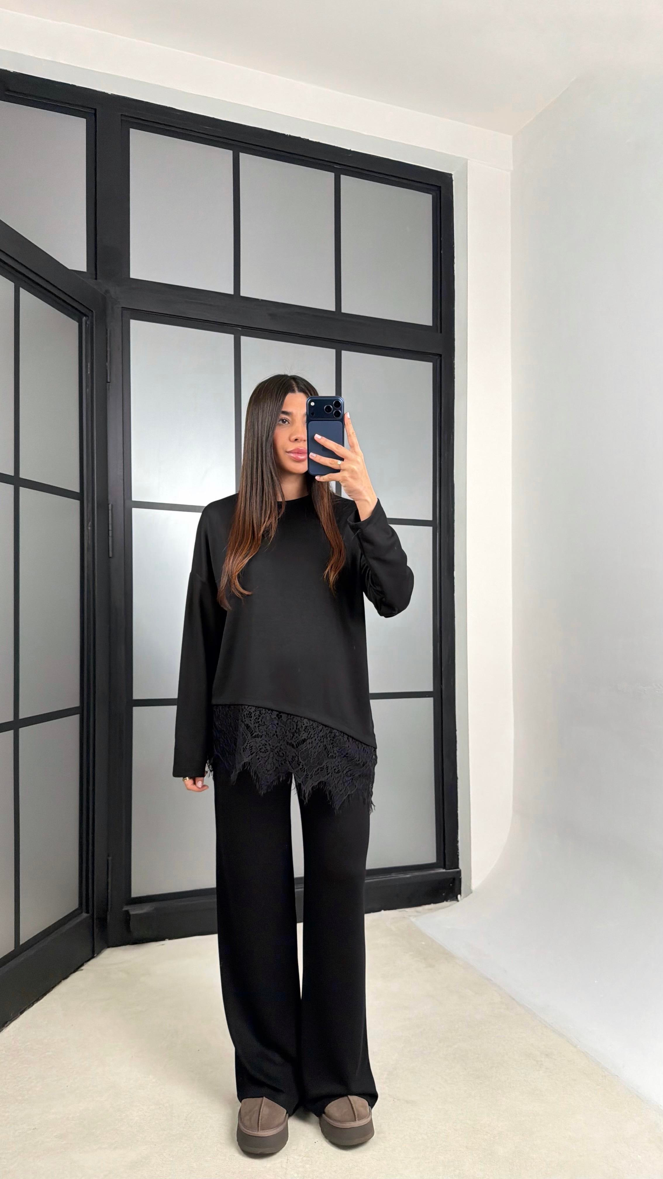 Siyah Dantel Detaylı Beli Lastikli Modal İkili Takım GAUS-01207