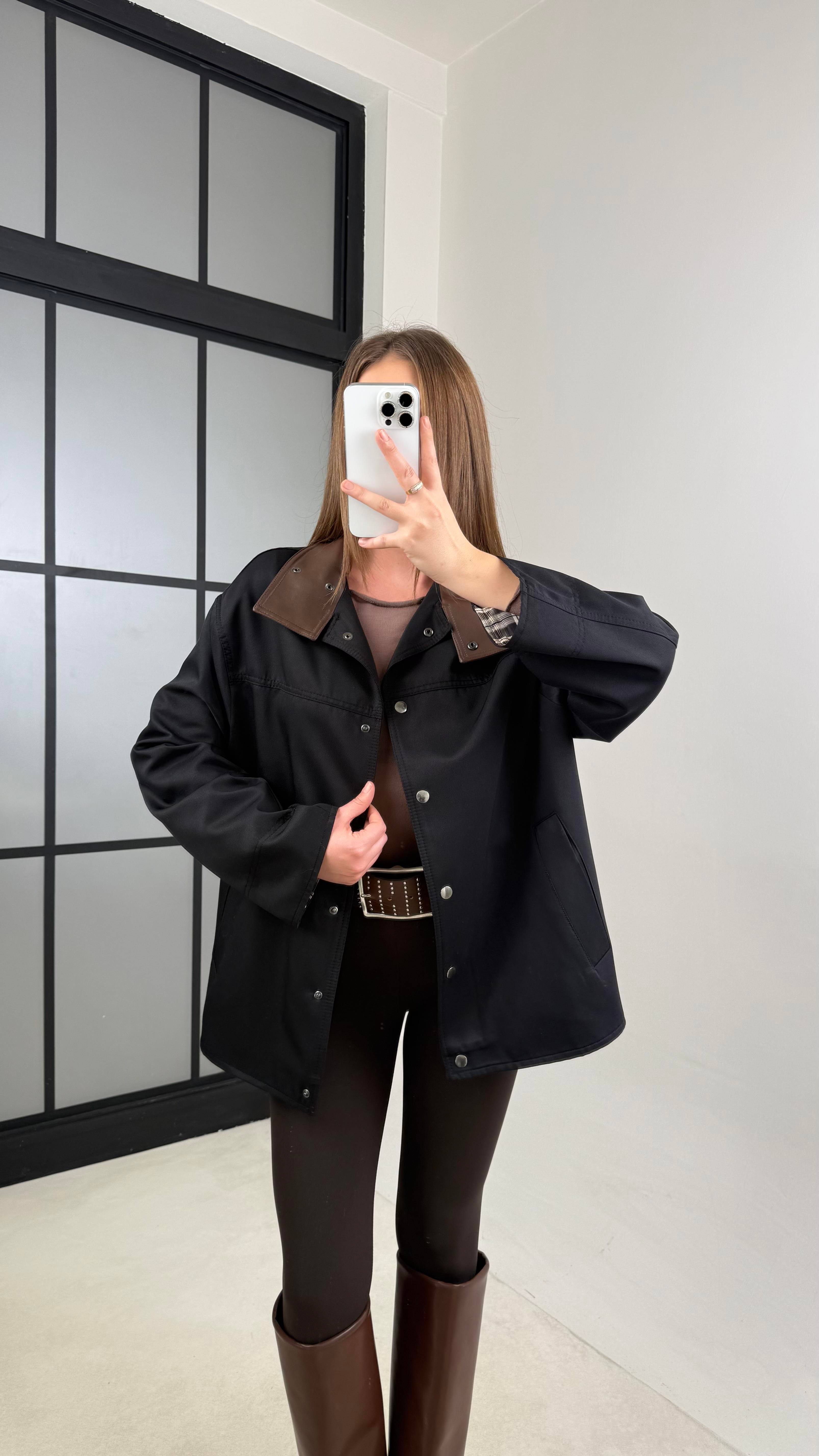 Siyah Deri Yaka Detaylı Astarlı Muadil Ceket GAUS-00732