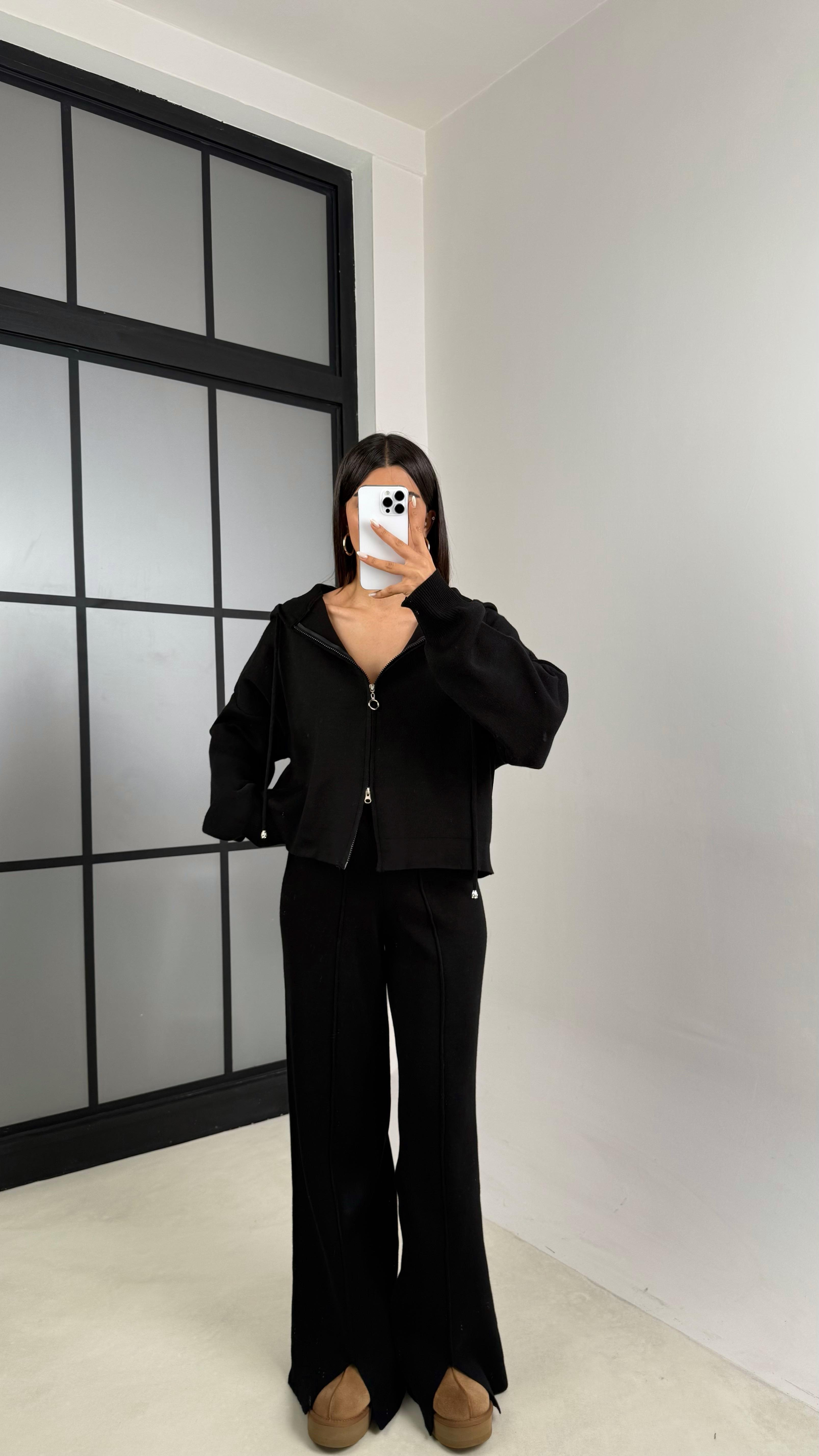 Siyah Kapüşonlu Hırka Beli Lastikli Pantolon İkili Triko Takım GAUS-00564GAUSTAKIMGAUS-00564