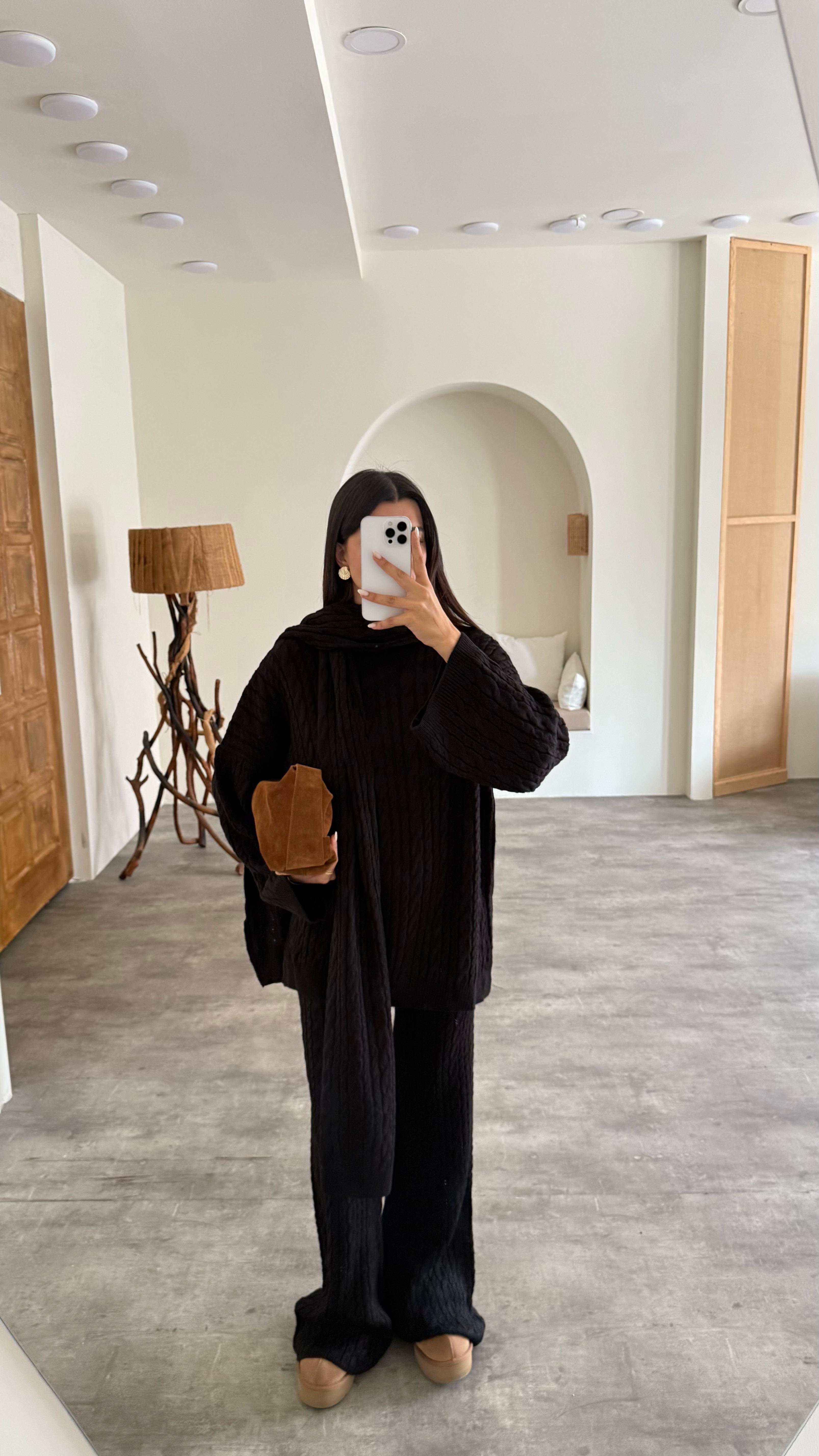 Siyah Kazak Atkı Beli Lastikli Pantolon 3'lü Örgü Kumaş Takım GAUS-00212GAUSTAKIMGAUS-00212