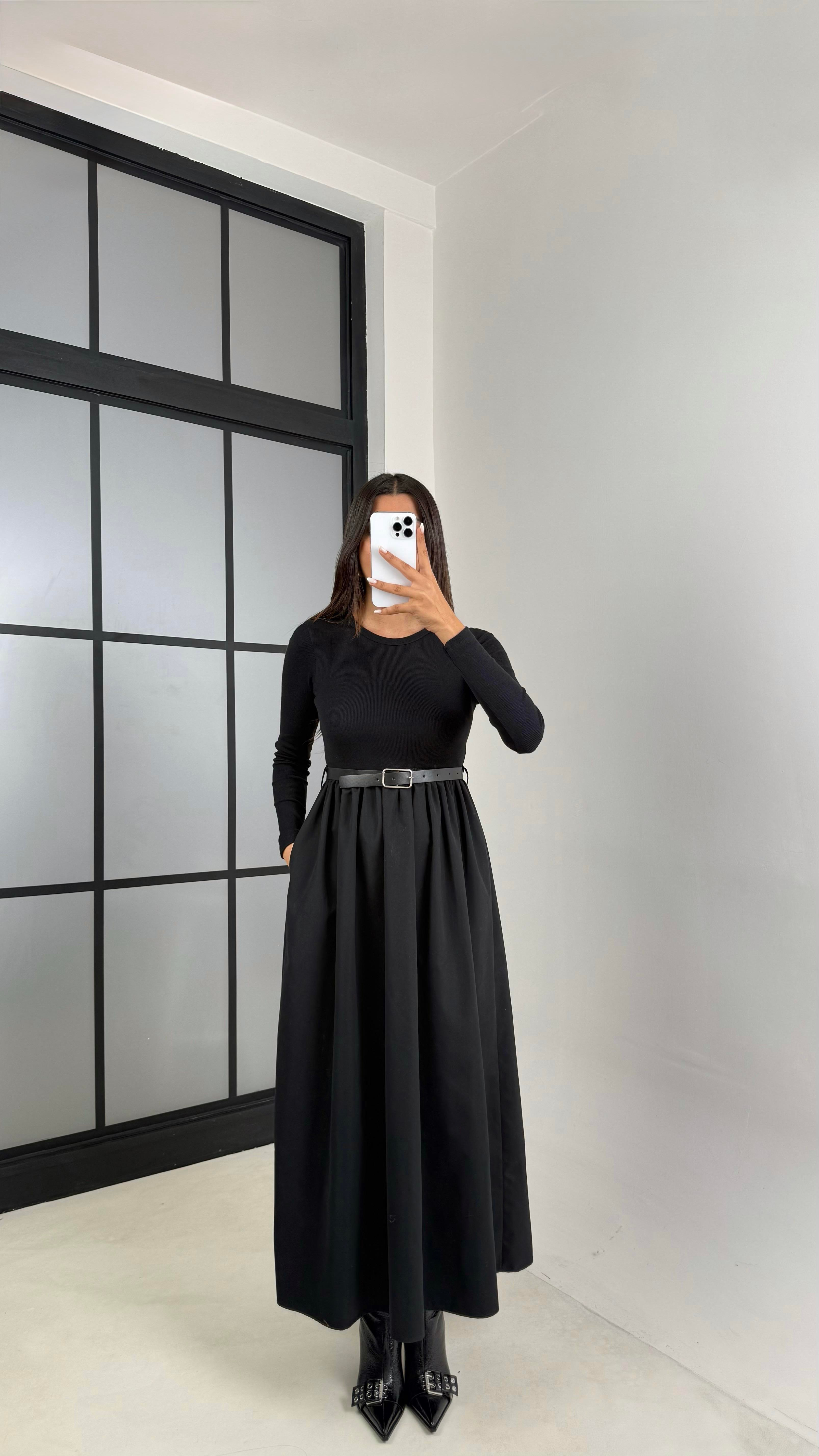 Siyah Uzun Kol Beli Lastikli Kemerli Pinterest Elbise GAUS-00518GAUSELBİSEGAUS-00518