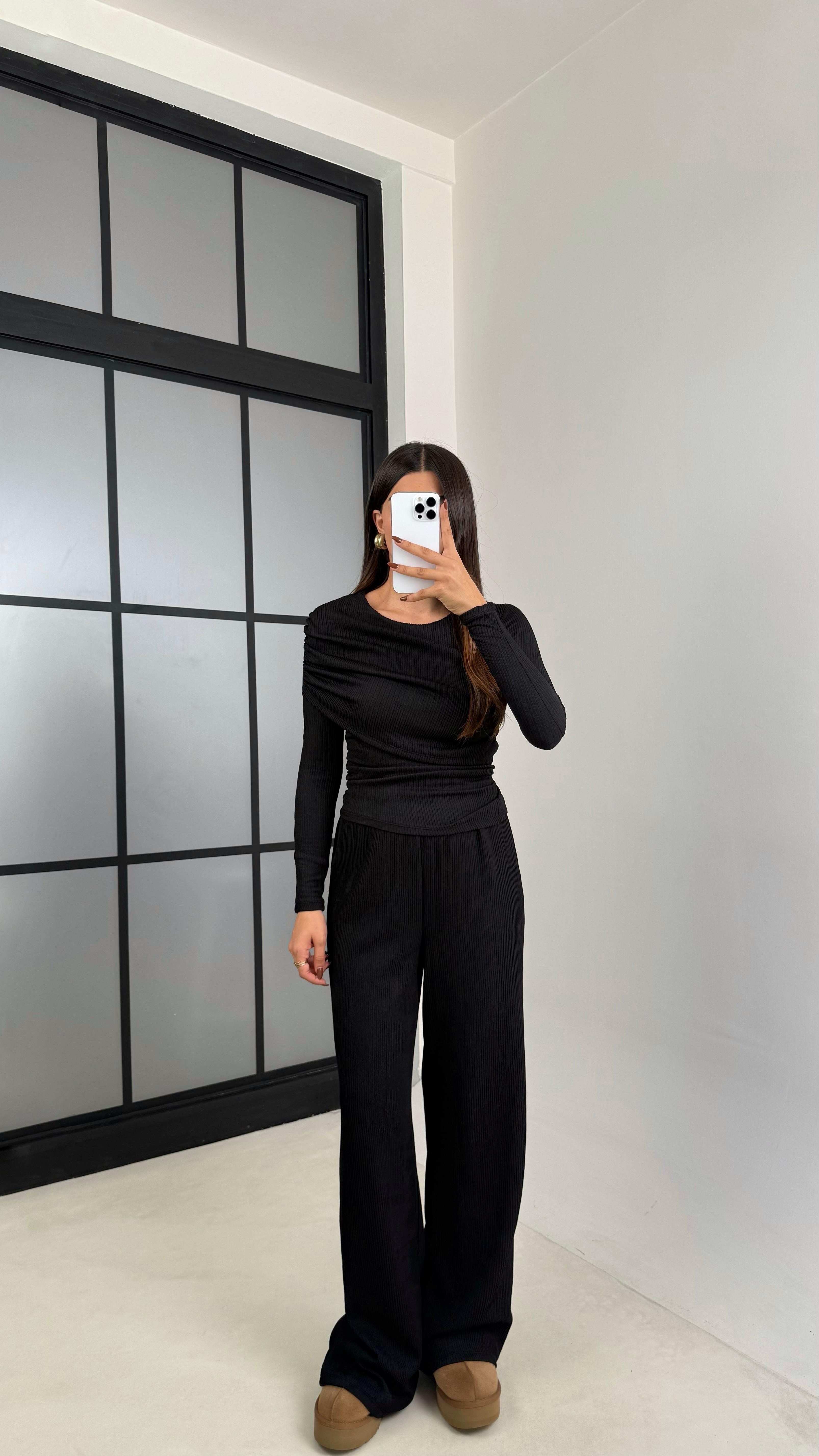 Siyah Yaka Detaylı Bluz Beli Lastikli Pantolon Gofre Kumaş Takım GAUS-00229