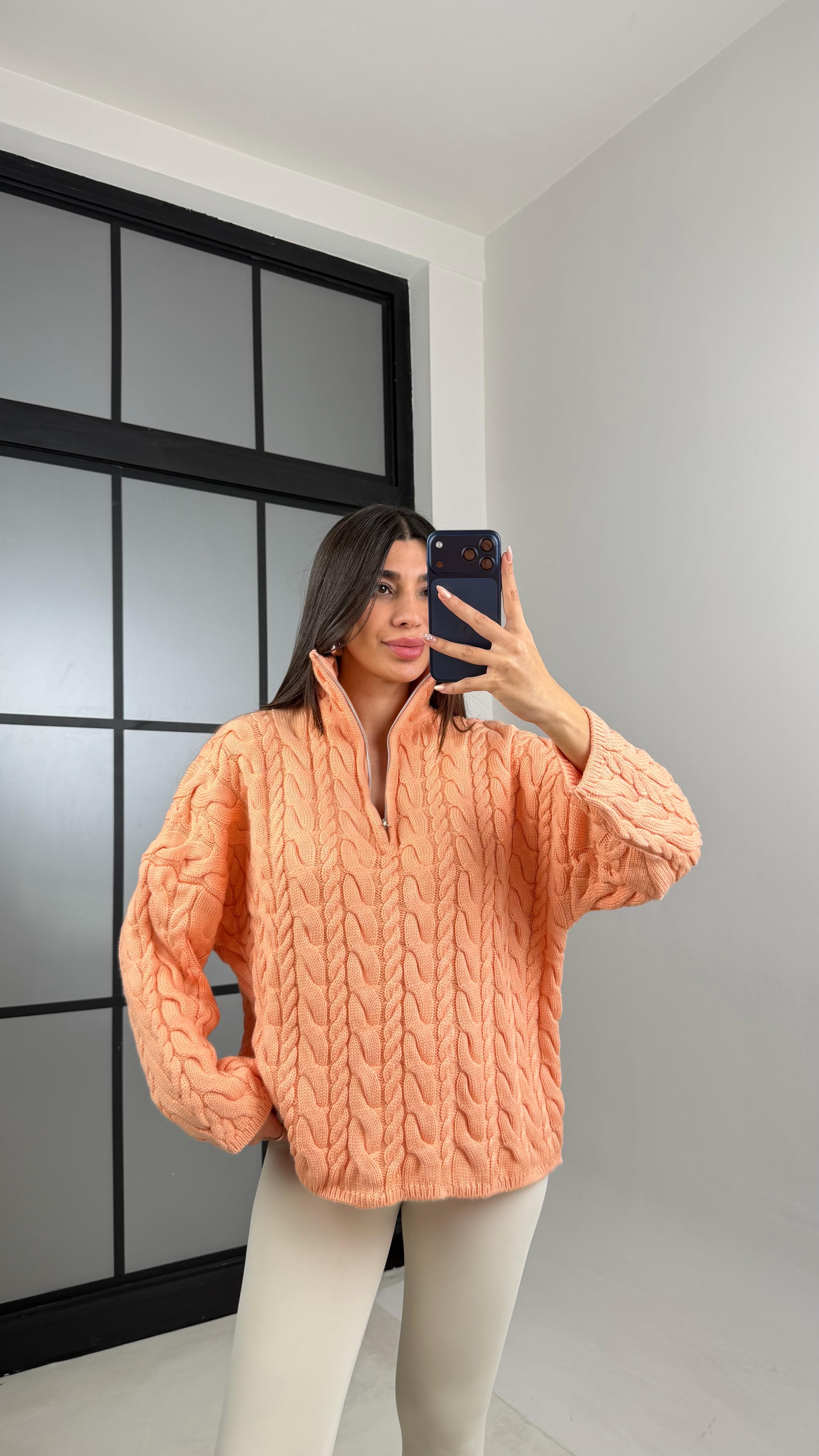Somon Fermuarlı Saç Örgülü Kazak GAUS-00855