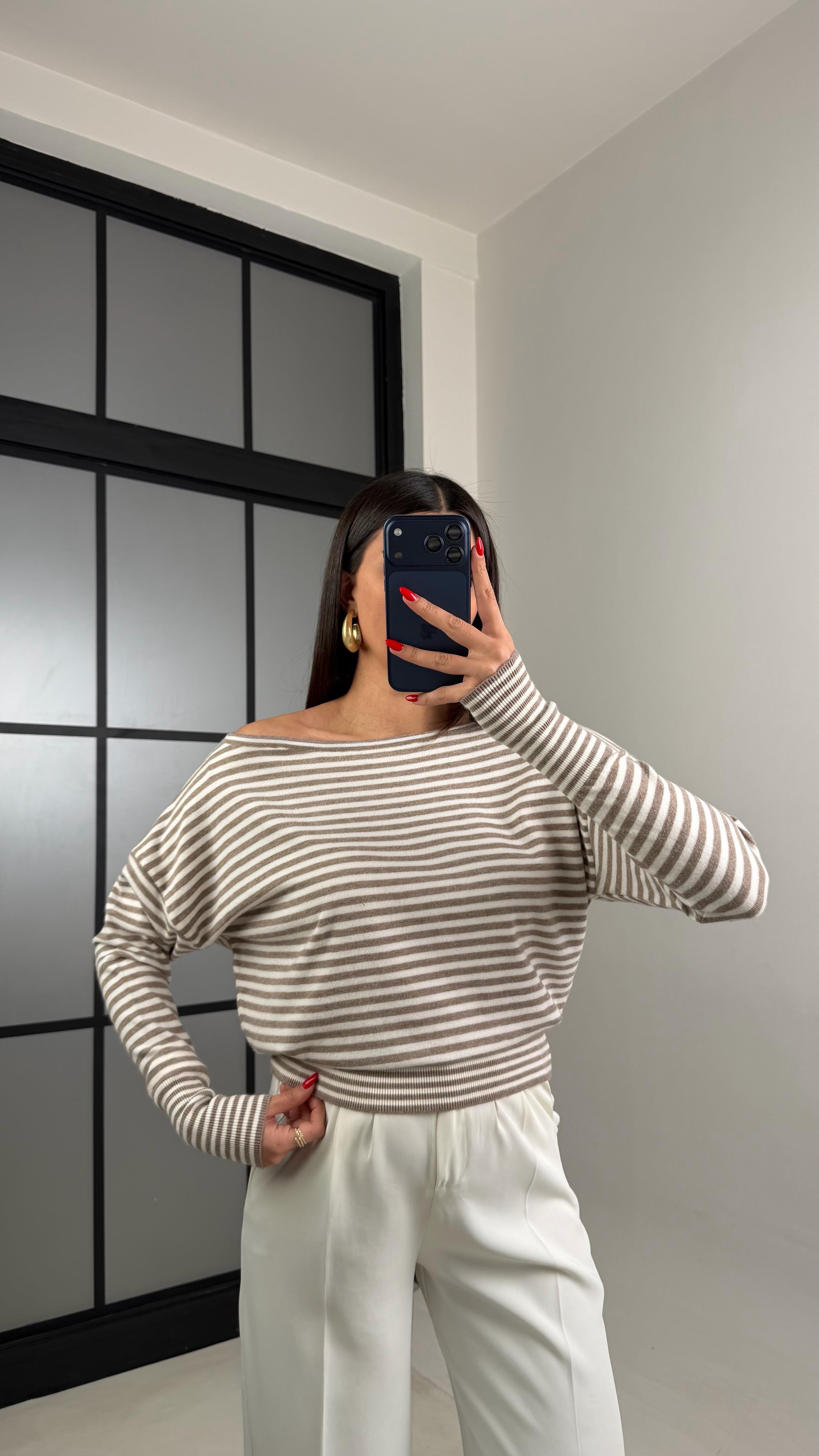 Vizon İnce Çizgili Kayık Yaka Bluz GAUS-00955