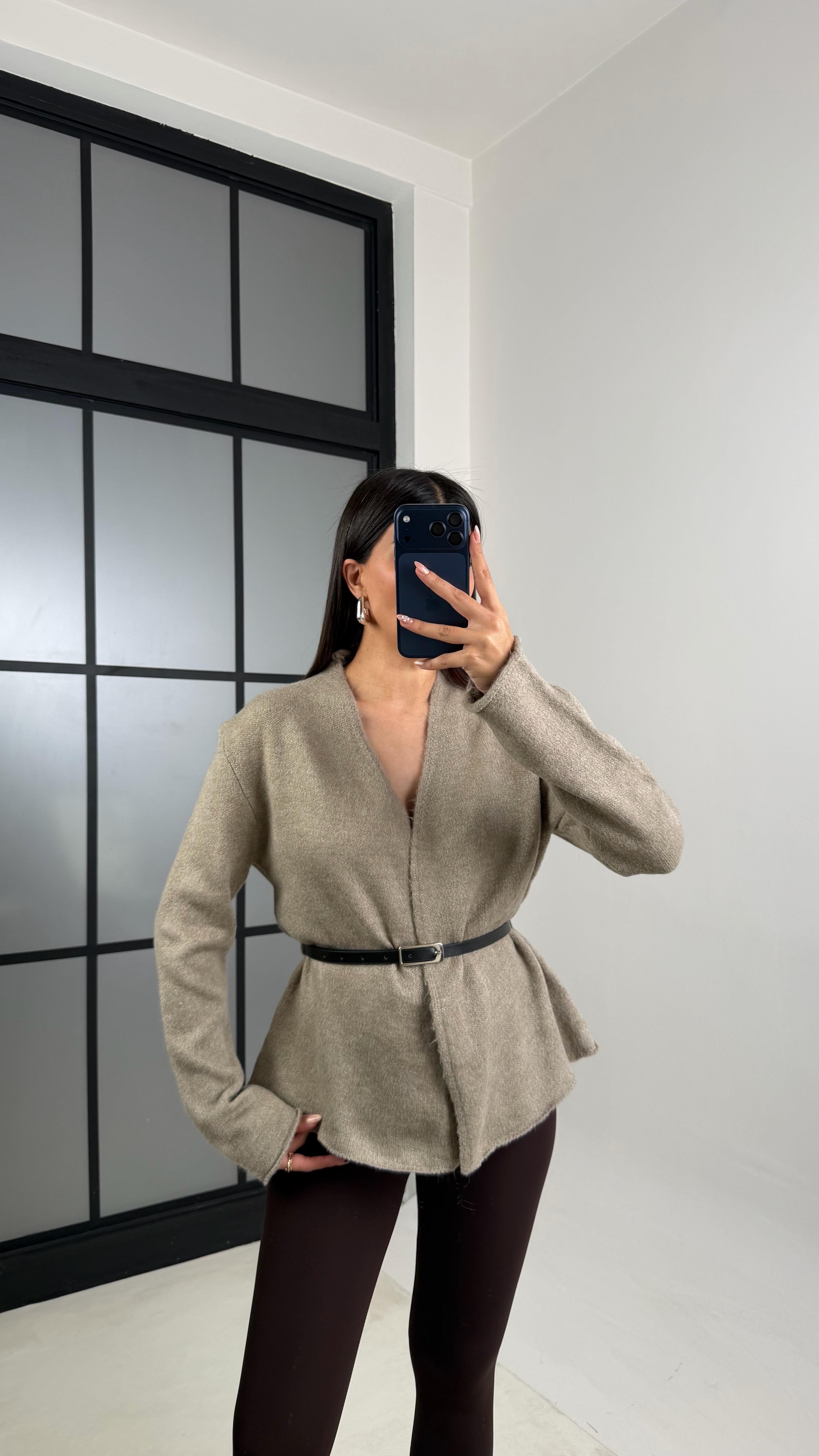 Acı Kahve Kemerli Yumuşak Dokulu Triko Hırka GAUS-00784 Vizon Kemerli Yumuşak Dokulu Triko Hırka GAUS-00784
