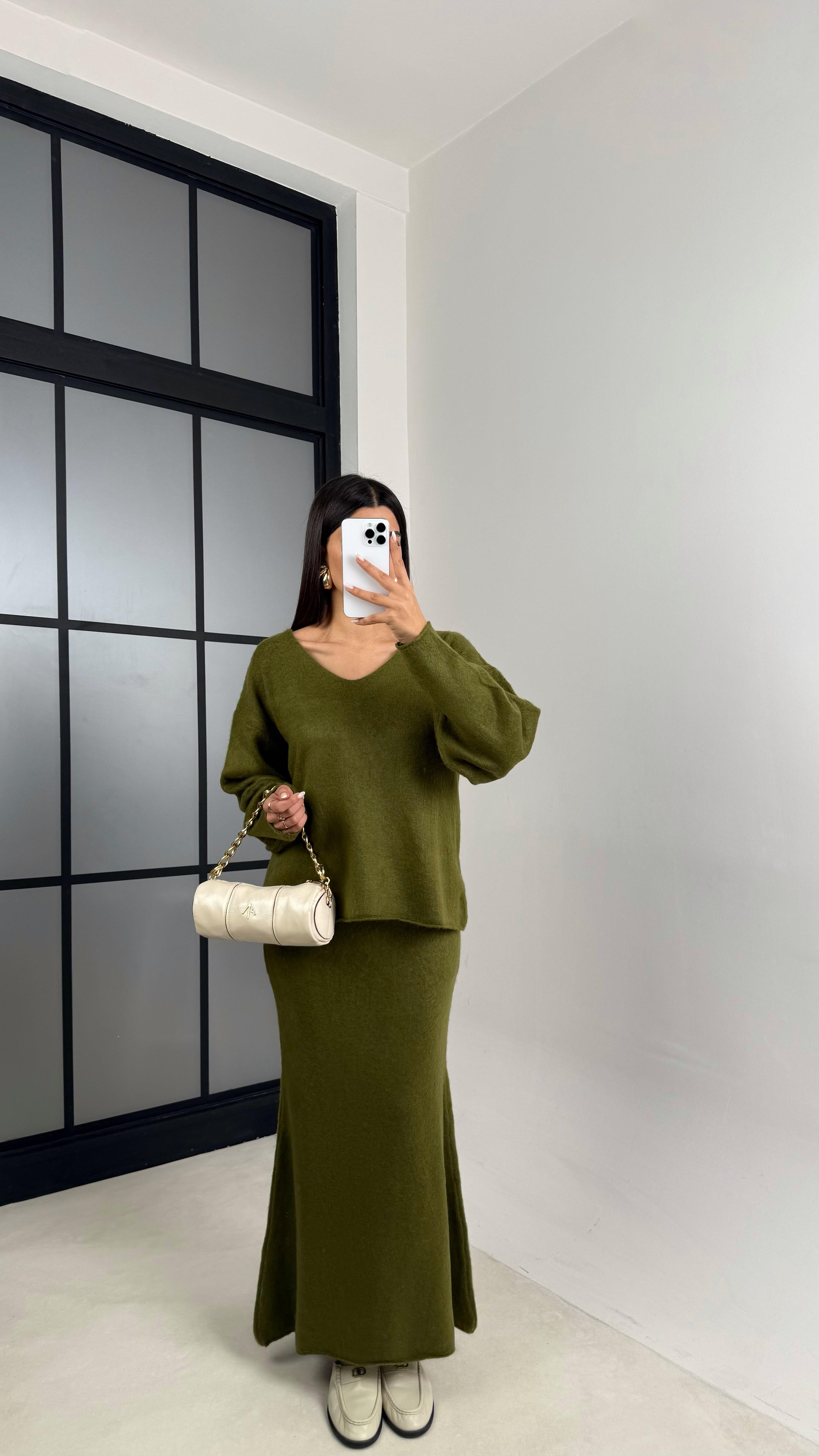 Yeşil V Yaka Kazak Beli Lastikli Etek İkili Triko Takım GAUS-00528GAUSTAKIMGAUS-00528