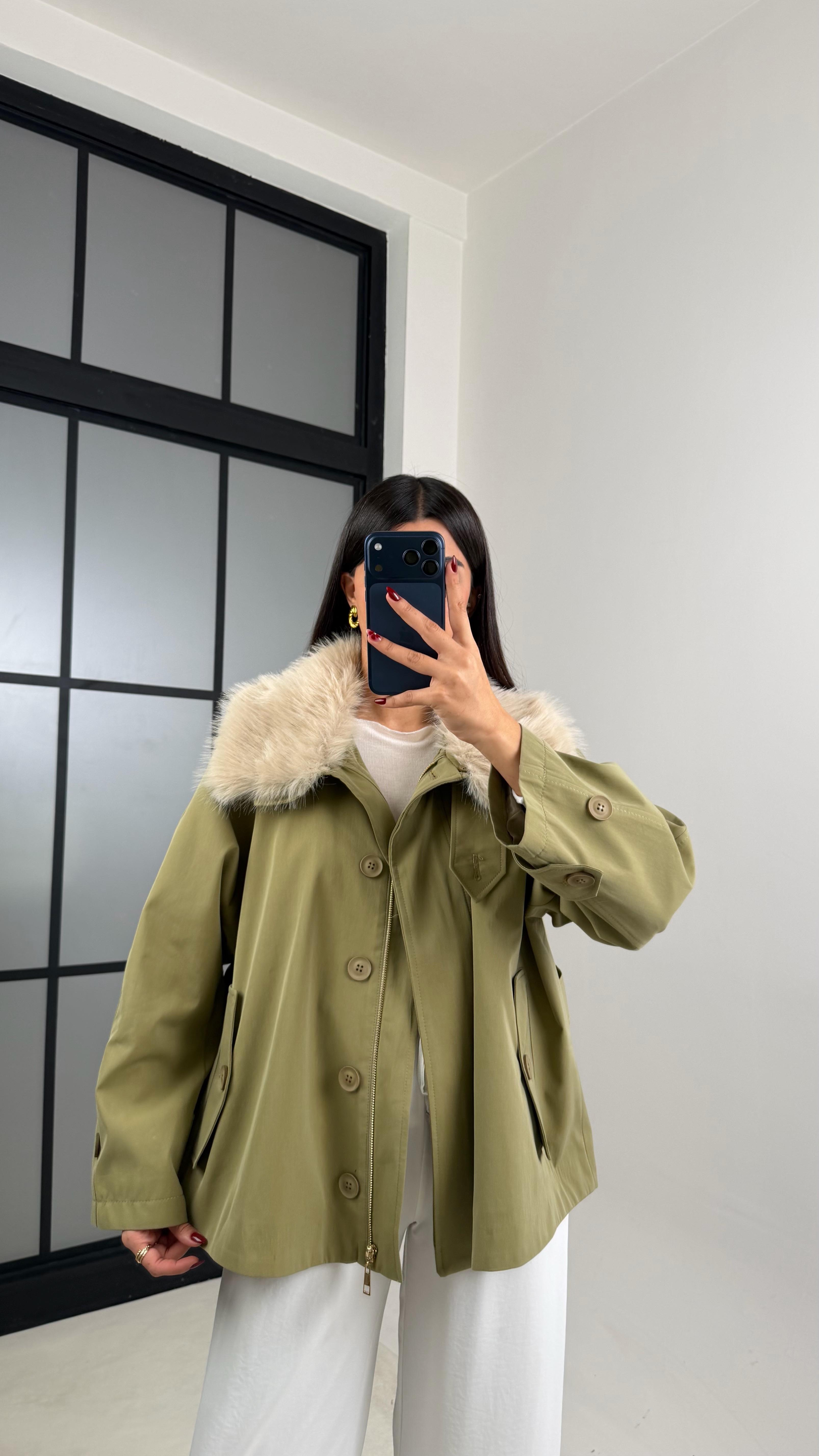 Yeşil Yaka Kürk Detaylı Astarlı Trençkot GAUS-00660
