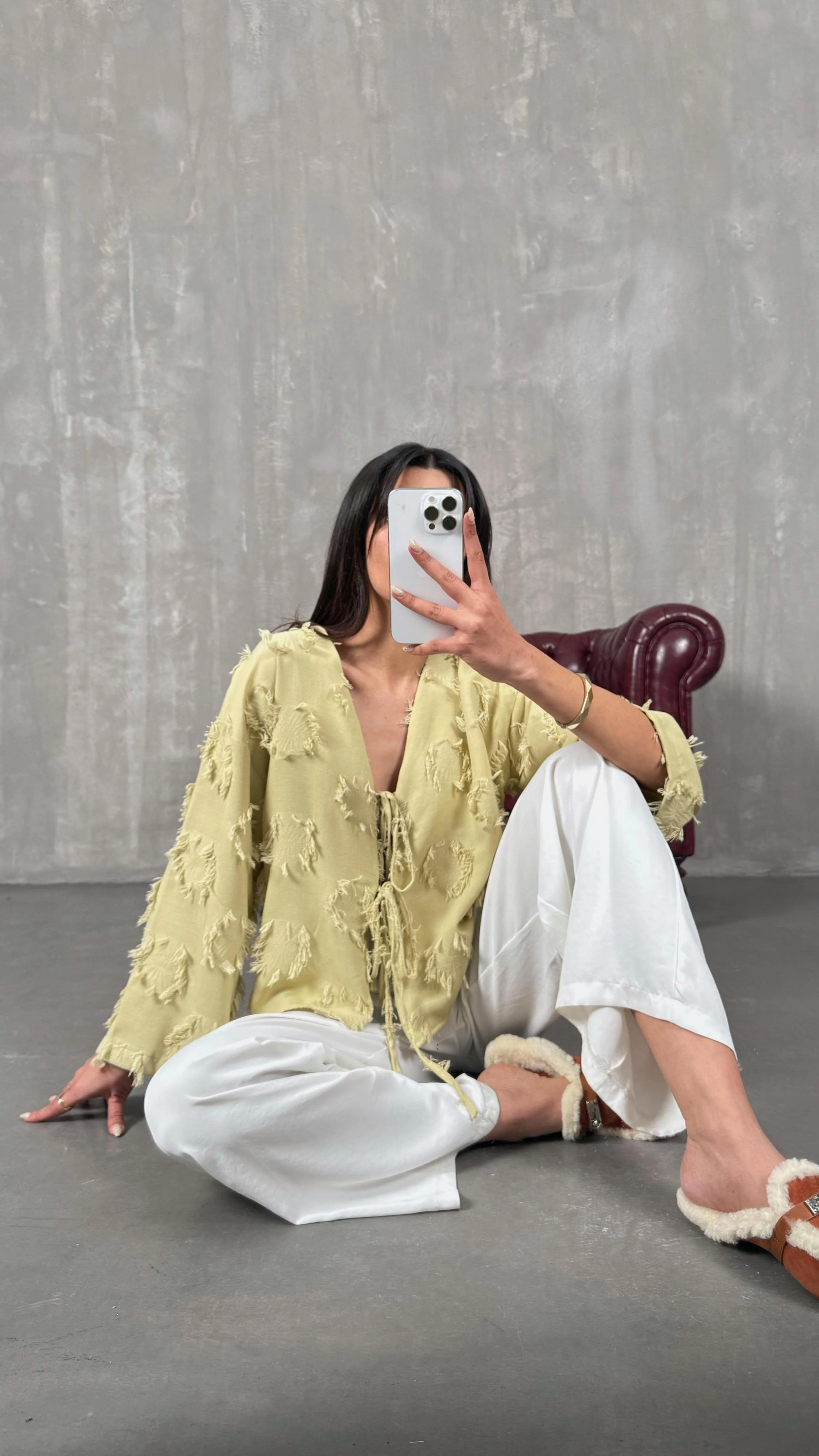 Yeşil Zenit Püskül Detaylı Bağlamalı Keten Gömlek GAUS-01147